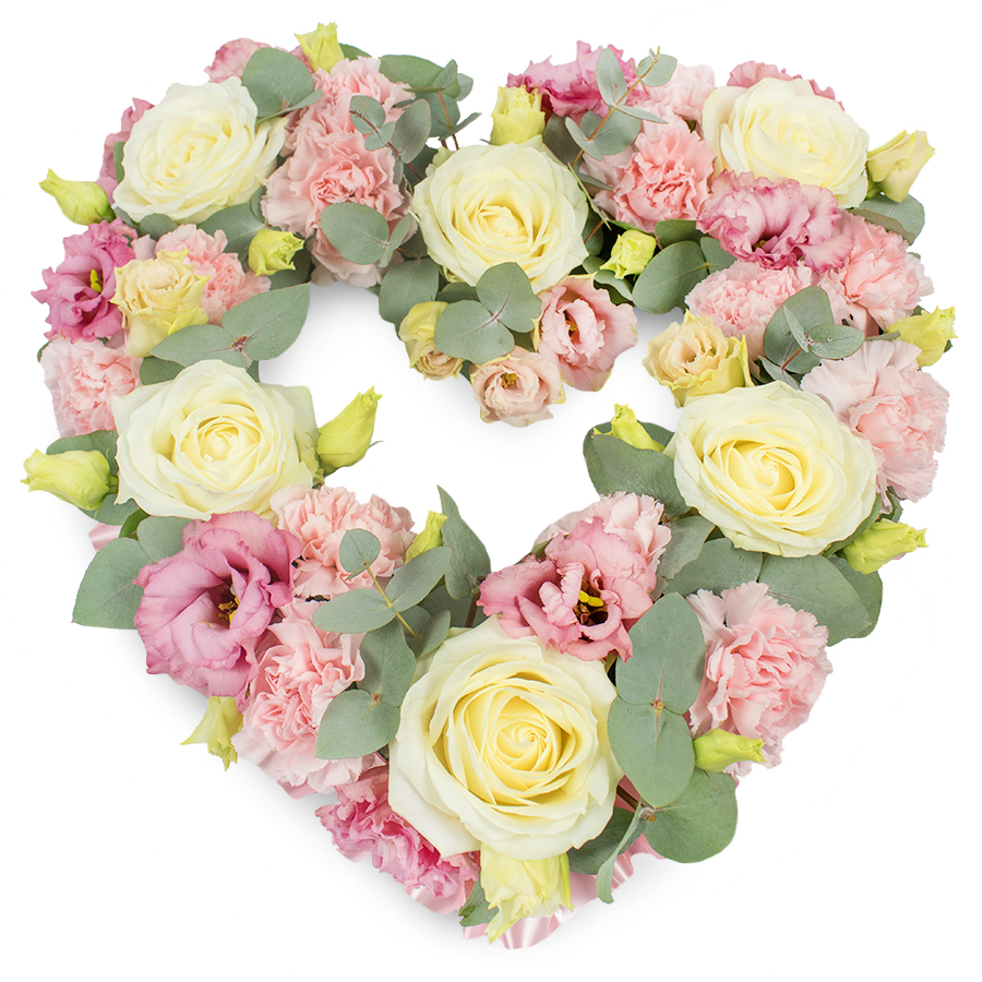 Express your deepest condolences with our Beautiful Open Heart Sympathy Bouquet. This elegant arrangement includes white roses, pink carnations, pink lisianthus, and eucalyptus leaves, all carefully selected to ensure freshness and lasting beauty.